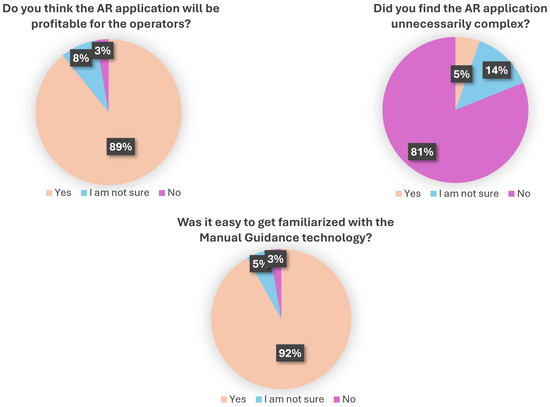 Figure 16 summarizes the obtained operator feedback on the three posed questions, obtaining positive comments about the application of these two technologies in heavy part-handling tasks.