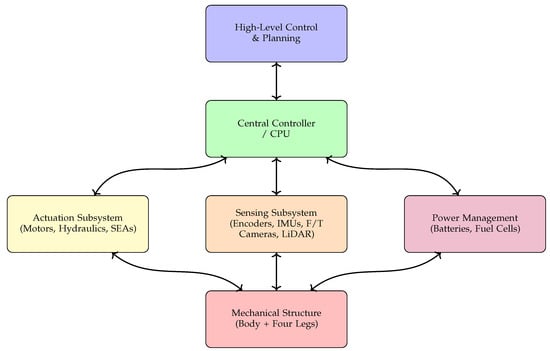- High-Level Control and Planning: This layer hosts the global mission logic, consisting of the gait scheduler, path planner, and task planner. It streams abstract commands (desired body velocity, foothold sequence, torque budgets) downwards to the central controller, while status and fault flags are fed back upwards for online replanning.