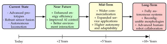 As shown in Table 2, the evolution of quadruped robots reflects a transition from conceptual prototypes to sophisticated machines capable of complex tasks in real-world environments. The technological drivers have shifted from basic mechanical designs and locomotion theories in the early years to advanced AI integration, enhanced autonomy, and human–robot interaction in more recent times.