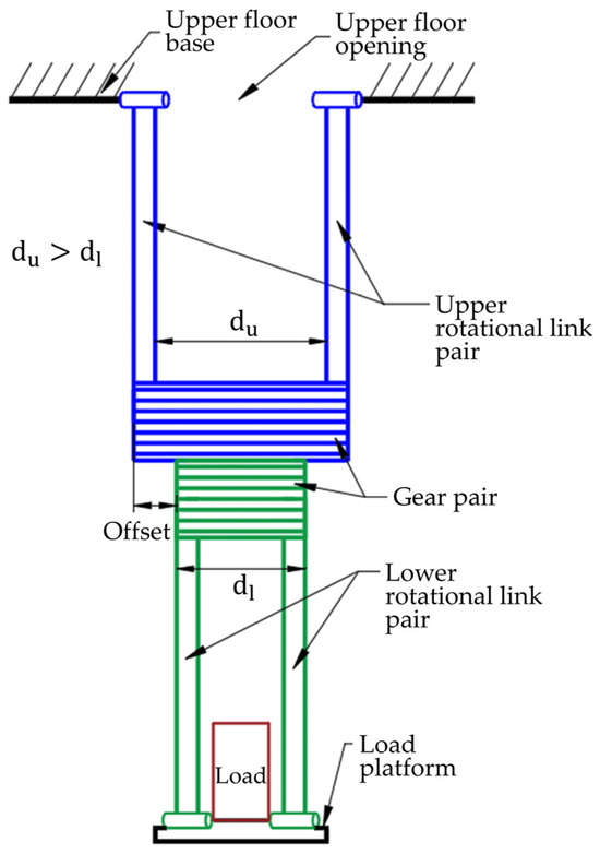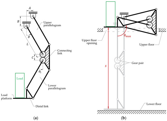 The double-parallelogram mechanism is commonly used in palletizing robots due to its ability to maintain a specific angle relative to the ground during motion [16]. However, the proposed lifting robot only requires repetitive vertical movement along a single path, eliminating the need for three degrees of freedom. Therefore, two parallelogram linkages were connected using gears, reducing the degrees of freedom to one. Figure 1 shows a schematic design of the proposed lifting robot. The base is positioned on the upper floor. In the initial posture of the robot (, as shown in Figure 1b, the load platform is located on the lower floor, ready to load materials. Due to the characteristics of the parallelogram structure, the load platform, positioned at the distal link, maintains a horizontal orientation relative to the ground during motion. The driving target is the position where the distal link reaches the base, at which point materials are transferred. Here, L represents the length of the rotating link, A and B denote the offsets between the rotating links, C indicates the distance between the gears, and represents the rotation angle of the rotating link. Then, the rotation angle of the rotating link and the stroke of the load platform at the driving target are calculated as follows: