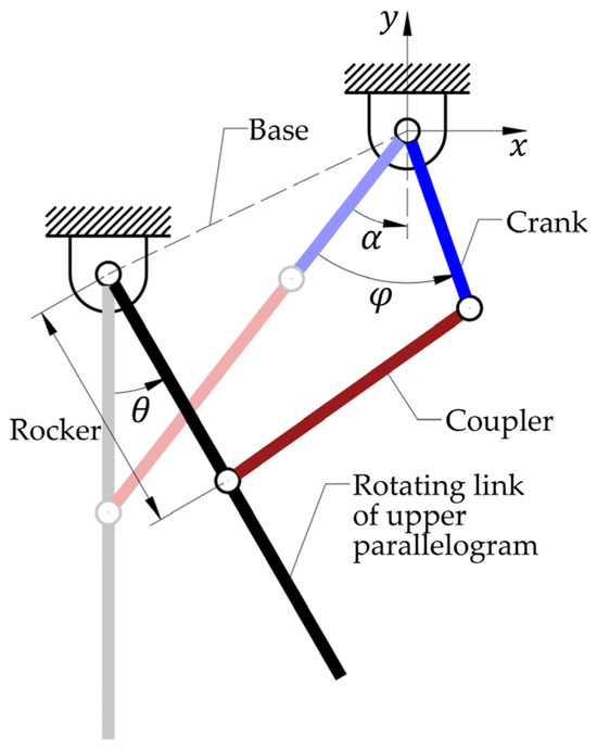 As shown in Figure 3, a crank-rocker mechanism can be attached to the rotating link of the upper parallelogram for actuation. The lengths of the links that constitute the crank-rocker mechanism are determined to satisfy Grashof’s condition and enable repetitive motion between and . To satisfy Grashof’s condition, which determines whether a four-bar linkage can achieve full rotation of a designated link, the following condition must be met: