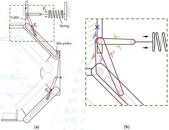 Cable path design for spring elastic energy transmission: (a) Overall cable path, (b) Detailed path of the green box section. The cable passes through the spring, the pulley on the link, and the fixed pulley on the rotating axis in sequence.