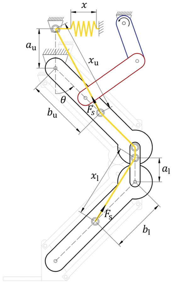 Meanwhile, since the length of the cable wound around the pulley remains constant regardless of the robot’s posture, the size of the pulley does not affect the elastic energy transmitted to the robot [20,22]. Furthermore, because the spring is located outside the robot and a thin cable is used instead, the robot can be designed with a narrower width. This allows for easier adaptation to constrained environments, such as maneuvering through narrow openings in actual construction sites. To calculate the torque compensated at the joints by the force transmitted through the cable, the upper and lower parallelogram linkages were modeled as a single equivalent rotating link, as shown in Figure 6, and analyzed using a static equilibrium model. Here, the deformed lengths of the spring, due to the lower parallelogram linkage and due to the upper parallelogram linkage , are determined by the positions of the pulleys and the distances between them ( and ), as expressed in the following equations.
