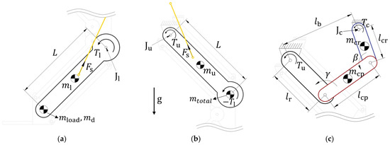 In order to calculate the torque required to maintain the robot’s posture at the driving joint, the torques at the gear joint and the upper rotating link joint have to be calculated based on the robot’s posture. First, as shown in Figure 7a, the torque is transmitted through the gears , which results from the loads of the lower rotating link , the distal link , and the transported material , and the cable tension is calculated as follows:
