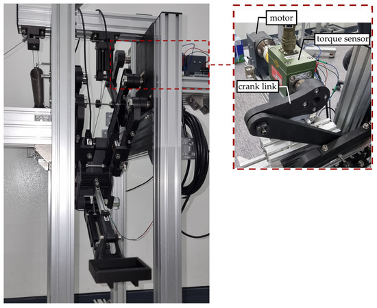 The length of the rotating link was set to , with offsets between the rotating links of and . The upper and lower rotating links were connected using gears with a module of 2 and 18 teeth, resulting in . Based on Equations (1) and (2), the vertical travel distance was determined to be , and the maximum rotation angle of the rotating link was calculated as . As explained earlier in Figure 2, the width of the lower rotating link pair is narrower than that of the upper rotating link pair, allowing for operation without component collisions. The weights of the upper and lower rotating links were measured as and , respectively, while the weight of the connecting link was measured as . The weight of the distal link, including the material load platform, was measured as .