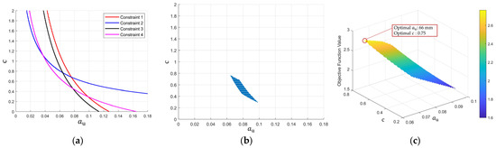 Results of the design parameter optimization process: (a) Constraints, (b) Feasible region, (c) Objective function values for feasible parameters.