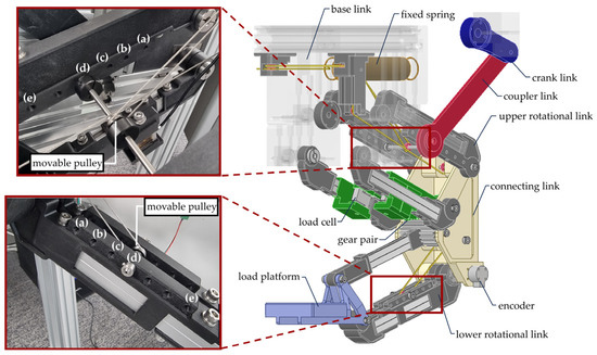 Spring was pre-tensioned by 63.96 mm to satisfy the zero free length condition. According to Equation (8), when is at its initial position of , the spring is stretched from to . At the final position of , the spring extends from to . In the experiment, considering the safety margin, testing was conducted only up to . Figure 10 illustrates the movable pulley positions corresponding to Table 2, where the idle pulleys can be repositioned accordingly. Since the cable length remains fixed, the initial length of the spring is adjusted to satisfy the required conditions as the pulley positions change. In addition, to bridge the gap between the theoretical gravity compensation and that of the actual prototype, a 250 g weight was used for calibration.