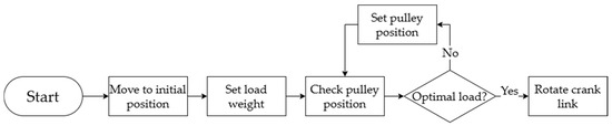 To adjust and , holes were created, as shown in Figure 10, allowing for the manual adjustment of the movable pulley positions. By positioning the pulleys at different points, the elastic energy exerted by the spring on the rotating links is modified, thereby increasing or decreasing the appropriate load capacity. The control strategy employed in the proposed lifting mechanism is structured as a simple repetitive operation loop. The flowchart in Figure 11 illustrates the control sequence, comprising three main cycles: initialization, mode setting, and repetitive operation. During the initialization cycle, the system moves to the initial position, sets the load weight, and adjusts the pulley position based on the detected load. In the mode setting cycle, the pulley position is further adjusted according to the specified load. Once the mode setting is complete, the repetitive operation cycle begins. The repetitive operation cycle involves continuous rotation of the crank link to execute material transport tasks based on the defined pulley position and load weight.