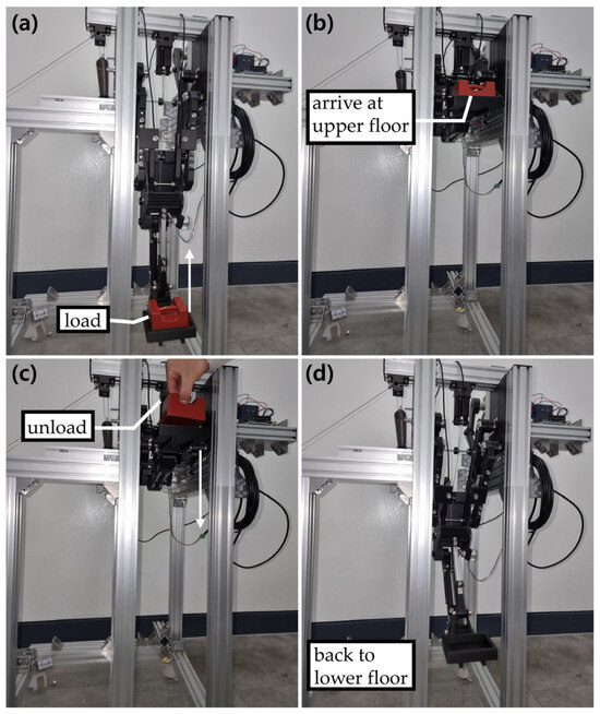Procedure of one cycle driving experiment: (a) Ascending with load, (b) Arrival at target position, (c) Load removal, (d) Descending without load.