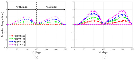 In the preceding Section 4, three experiments were conducted to validate the effectiveness of the proposed mechanism. As observed in the results of the first experiment, which involved measuring the drive torque, the maximum torque during the ascending and descending motions was measured to be nearly identical when the optimal load was applied at each pulley position. Furthermore, the measured torque profiles for the upward and downward motion with and without a load exhibit a symmetric distribution. Given the symmetric nature of the torque profile, the torque values for the downward motion with a load can be inferred from the downward motion without a load by reflecting the torque curve across the x-axis. Thus, the experimental results can effectively represent both loading scenarios within a single graph, confirming the design objective of maintaining consistent torque requirements regardless of the load condition during the ascent or descent phases.