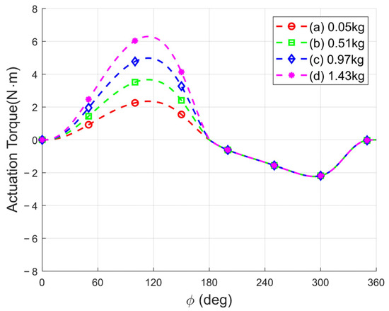 The robot proposed in this study follows a cycle in which it loads materials when load platform is on the lower floor, transports them to the upper floor, and then returns to the lower floor as Figure 4. Consequently, the load on the load platform varies within a single cycle. By considering this load variation and utilizing Equation (12) to ensure that the maximum torques in the presence and absence of are equal as , the required driving torque can be minimized, thereby reducing the actuator capacity. Under this condition, the optimal that minimizes the driving torque can be determined based on the parameters that define the compensation torque, and it is calculated as follows.
