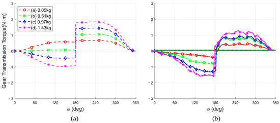 Simultaneously with the driving torque measurement experiment, the torque variation between the gears was also measured. To achieve this, as shown in Figure 15, a load cell was attached to an extended link connected to the gear. When the lower gear exerts force on the upper gear, the load cell measures this force. The measured force is then converted into torque by multiplying it by the length of the extended link, d. Since the converted torque has the same magnitude but the opposite direction as , the measured value is multiplied by (−1) to correct the sign. During one complete cycle of operation, as illustrated in Figure 11, the force transmitted through the gears was recorded, and the results are presented in Figure 16. The maximum torque values for each condition are summarized in Table 5.