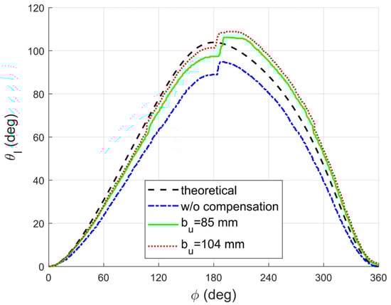 To measure this, a rotary encoder was attached to the lower rotating link, as shown in Figure 17. The encoder used was the AN25-Analog model from Dream Solution Co., Ltd. (Ansan, Republic of Korea), featuring a resolution of 0.0879° (4096 PPR). The angular displacement of the lower rotating link was recorded throughout one full cycle of operation and plotted against the motor angle. The experiments were conducted with a reference load of . Measurements were taken for three cases: when the movable pulley was positioned at the optimal location , when less elastic energy was applied at , and when no gravity compensation was applied. The measured data were then compared with the theoretically simulated values to evaluate the positioning error. The results are presented in Figure 18, and the angular data at the target position, where the motor angle reaches 180°, are summarized in Table 6.