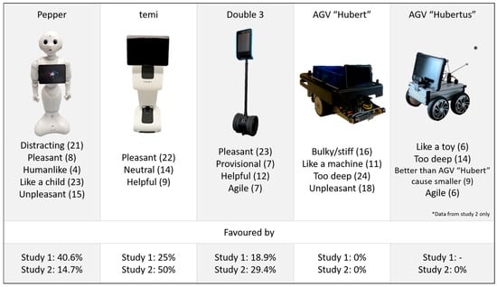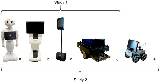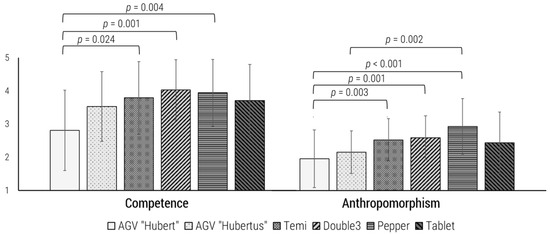 Figure 10, “Hubert” is a guided vehicle designed to move items in an industrial scenario. In the present study, it was equipped with a tablet to be able to communicate—for example, in tasks where it should move items and a remote assistant needed to be able to communicate with another person. Based on the results of study 1, it could be assumed that the height of the communication medium could have influenced the assessment. In contrast to the other TPSs, the tablet for the AGV “Hubert” was at a level of approximately 30 cm above the floor, whereas the tablets of the other TPSs were approximately at eye-level for the seated participant. However, the results of study 2 contradicted this, as the AGV “Hubertus” exhibited a similar height of the communication medium as the AGV “Hubert” and yet its competence ratings did not deviate significantly from those of the other TPSs. It can be concluded from these results that although the height of the communication medium was associated with the competence rating, as both AGVs scored descriptively lower than the other devices, it is not solely responsible for the lower rating. A third possible reason for the lower evaluation in terms of competence for the AGV “Hubert” could be the bulkiness of the TPS, which was intended for the transportation of loads. In contrast to the AGV “Hubert”, the AGV “Hubertus” is a rather agile, more maneuverable system and is similar to the other TPSs in its dimensions (depth x width, except in height).