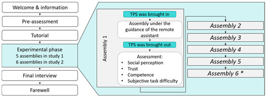 The present studies are not without limitations: The remote assistant, who delivered the instructions for the assembly task, was female and of a comparable age across all experimental conditions to facilitate comparability. Nonetheless, subsequent research should further explore the hypothesized influence of the remote assistant on the assessment of the TPSs. An additional constraint arose from technical difficulties: in both experiments, the audio feature of Pepper’s tablet was inoperative; consequently, it was determined that a separate tablet should be utilized exclusively for audio playback. This alternative tablet was positioned in close proximity to both Pepper and the participants.