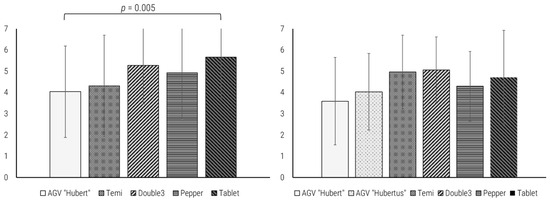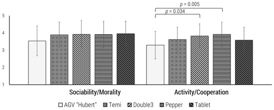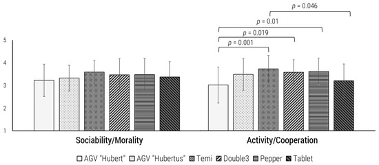 The results of the two studies regarding anthropomorphism showed that in both studies, the AGV “Hubert” was perceived as less anthropomorphic, with significantly lower values than the values of Double 3 and Pepper in both studies. However, although all devices except the AGV “Hubert” showed similar anthropomorphism values in study 1, a more differentiated picture emerged in study 2: although temi, Double 3, and the tablet condition achieved similar values, this time, Pepper achieved the highest anthropomorphism values, which even differed significantly from the AGV “Hubert” and the AGV “Hubertus”. Comparing the results of both studies, it could be concluded that although the same survey instruments were used, the participants in study 2 made more differentiated assessments. Due to Pepper’s humanoid design, the results of study 2 are not surprising.