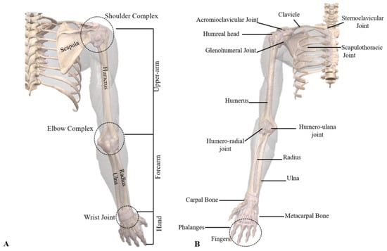 Composition of the human upper limb: (A) upper limb and (B) skeletal structure of the shoulder, elbow, and wrist [5].