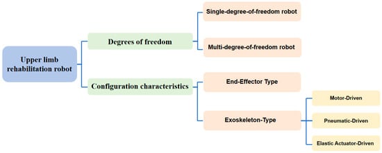 According to the degree of freedom, rehabilitation robots can be divided into single-degree-of-freedom robots and multi-degree-of-freedom robots. According to their configuration characteristics, rehabilitation robots are mainly classified into two types: end-effector robots and exoskeleton robots, as shown in Figure 4. End-effector robots typically train the affected limb along a predetermined trajectory through traction. Since the robot is only connected to the distal end of the patient’s limb, there is no need for the patient to align with the robot’s joints during movement. This makes the structure of the rehabilitation robot simple, easy to control, with lower design and maintenance costs, and it is well-suited to patients. On the other hand, exoskeleton robots involve the patient wearing a multi-degree-of-freedom robot, which can fit more complex three-dimensional spatial trajectories. Exoskeleton robots can be divided into motor drive, pneumatic drive, and elastic actuator drive according to the driving mechanism. These different configuration features and design methods provide rehabilitation robots with distinctive capabilities in movement assistance, human–machine interaction, and clinical rehabilitation training effectiveness.