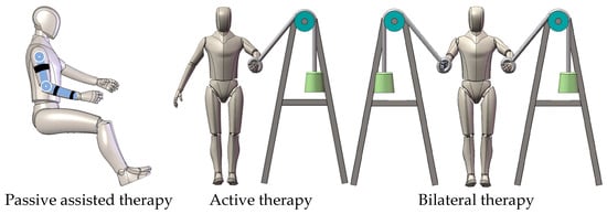 The recovery process for stroke patients typically consists of three stages: the passive assisted therapy phase during the subacute period, the active therapy phase during the recovery phase, and the bilateral therapy phase with some motor ability [56]. These rehabilitation methods help restore the patient’s limb mobility and coordination. The main rehabilitation modes are shown in Figure 7. Table 3 presents the summary of target patients, therapy procedure, and treatment types in terms of advantages. Depending on the specific needs of each rehabilitation stage, the rehabilitation modes of upper limb rehabilitation robots are divided into assistive mode, corrective mode, and resistance mode, with the assistive mode being the primary mode of the upper limb rehabilitation robot.