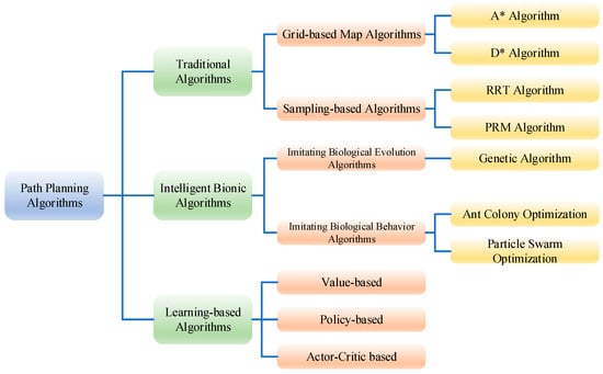 The development of robot path planning algorithms reflects the ongoing interaction and progress between algorithm theory and practical application needs. From early graph search techniques to today’s intelligent algorithms, path planning technology has undergone significant evolution to adapt to the complexity and diversity of environments [106]. Path planning algorithms began with simple graph search techniques, such as the A* algorithm, which is a new method combining heuristic algorithms like BFS with traditional algorithms like Dijkstra to find the shortest path in known environments. Thanks to its excellent flexibility, the A* algorithm is suitable for various scenarios and has become one of the most popular search methods [107]. The D* algorithm is an improvement of the A* static algorithm and is an incomplete replanning method based on the original data. D* is a fast and efficient optimization method, particularly useful for environments with uncertainty or changing conditions. Unlike A, which searches from the start to the goal, D works in reverse, from the goal to the start [108]. Random sampling methods and biomimetic algorithms provide solutions for path planning in unknown or partially known environments. Currently, deep reinforcement learning algorithms, with their excellent decision-making capabilities, have become a research hotspot for planning paths in unknown and complex dynamic environments. Commonly used path planning algorithms are shown in Figure 8.