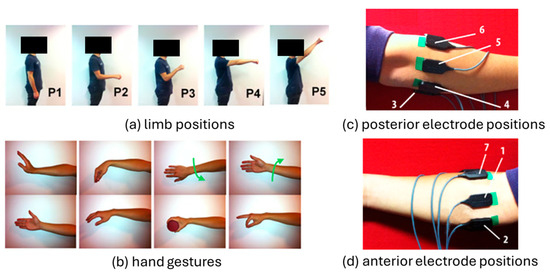 (a) Five limb positions (P1–P5), (b) eight hand gestures, and (c,d) electrode placements from Limb.Pos. dataset [7].