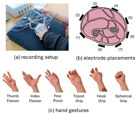 (a) Recording setup, (b) electrode placements and (c) recorded hand gestures from Amp.Force. dataset [6].
