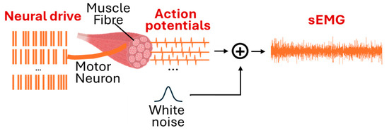 Figure 3 illustrates the forward generation process of an sEMG signal. The surface EMG (sEMG) signal represents the summation of the electrical activity from all the active muscle fiber action potentials (MFAPs) within the detection volume of the electrodes [35]. These MFAPs are generated by motor neuron activation and propagate through biological tissues, where they are subject to distortion caused by tissue impedance and noise, before reaching the skin surface [2,36]. The level of muscle force generated is regulated by the central nervous system through two primary mechanisms: the number of recruited motor units and the firing rate of these motor units [2,37].