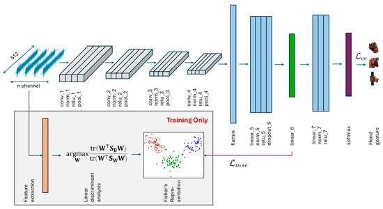 In light of this observation, we propose a hybrid CNN-LDA framework in this study. In regard to this framework, a 1D-CNN is used to extract the temporal features, so that the model’s latent representation approximates Fisher’s discriminant subspace of the LDA classifier. The novelty of our framework is that the feature extraction occurs only during the training stage, while, during inference, the model predicts hand gestures directly from raw sEMG signals.