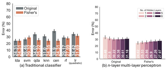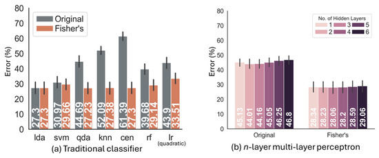 Comparison of recognition error (%) based on the Amp.Force. dataset using the original TD8-AR feature space and transformed into Fisher’s discriminant subspace for (a) seven traditional classifiers and (b) -layers MLP.
