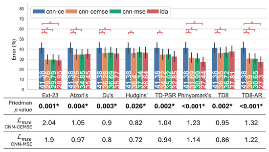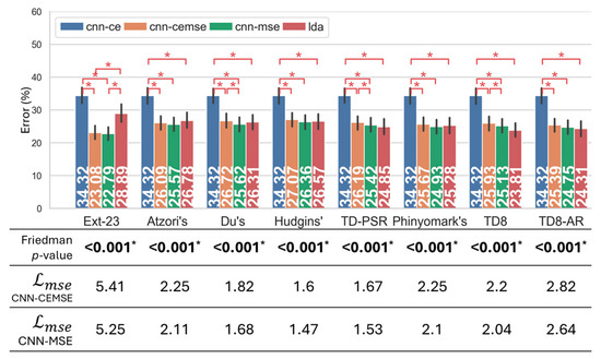 Figure 10 shows the recognition error based on the Amp.Force. dataset for all eight feature sets. The Friedman statistical test confirmed that there were significant differences between at least one pair of classification methods across all the feature sets (). In regard to the LDA classifier, TD8-AR, Phinyomark’s, and the Ext-23 feature sets were effective when subject to changes in the contraction force, with recognition errors of 27.3%, 27.44%, and 28.85%, respectively. Additionally, significant differences between the LDA and CNN-CE were confirmed in regard to these feature sets (). In contrast, the recognition error exceeded 32% for all the remaining feature sets, including the TD-PSR. The CNN-CEMSE and CNN-MSE consistently reduced the recognition errors across all the features compared to the CNN-CE, although the performance differences in regard to the LDA varied depending on the feature set. For the Ext-23 feature set, the CNN-CEMSE and CNN-MSE recorded recognition errors of 29.76% and 29.79%, respectively, each showing a 0.8% increase compared to the LDA. In contrast, when trained on Phinyomark’s and the TD8-AR feature sets, the CNN-CEMSE and CNN-MSE showed recognition errors more than 3% higher than the LDA.