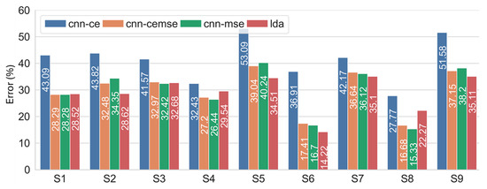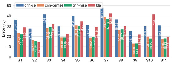 Regarding the recognition errors averaged across all training–testing contraction combinations for each subject (Figure 11), the CNN-CEMSE, CNN-MSE, and LDA effectively reduced the errors for every subject compared to the CNN-CE. S6 experienced substantial performance improvements using the CNN-MSE and LDA, achieving recognition errors of 16.7% and 14.22%, respectively, over a 20% reduction compared to the CNN-CE. Noticeably, for S8, both the CNN-MSE and CNN-CEMSE reduced the recognition error by over 10% compared to the CNN-CE and by more than 5% compared to the LDA.