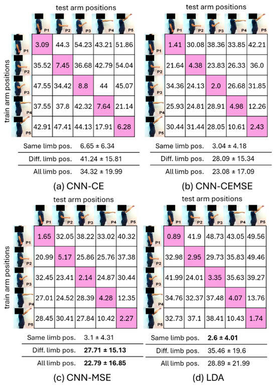 Average inter-limb position recognition error across all 11 subjects with four classification approaches and the Ext-23 feature set: (a) CNN-CE, (b) CNN-CEMSE, (c) CNN-MSE, and (d) LDA. Bold values denote the lowest recognition errors.