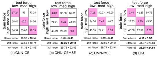 Average inter-contraction force recognition error across all 9 subjects with four classification approaches and the Ext-23 feature set: (a) CNN-CE, (b) CNN-CEMSE, (c) CNN-MSE, and (d) LDA. Bold values denote the lowest recognition errors.