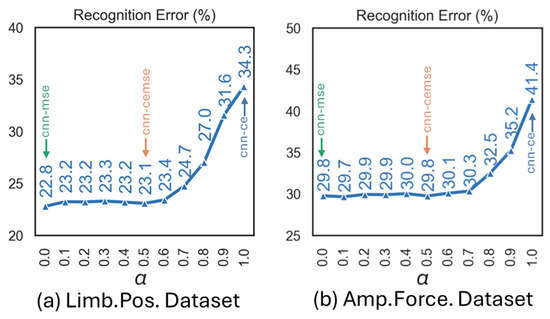 As shown in Figure 13, we have studied the effect of the hyperparameter in Equation (8) on the recognition error across two public datasets. It is observed that when , minimal changes in the recognition performance are seen based on both datasets. However, when the cross-entropy loss starts to become the dominant training loss (), an increase in recognition error is observed based on both datasets, highlighting the adverse effects of cross-entropy loss.