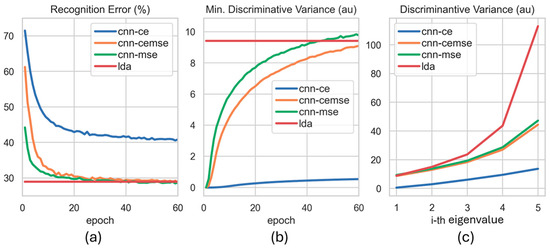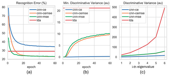 Our results also highlighted that cross-entropy loss adversely affected myoelectric hand gesture recognition. As shown in Figure 5 and Figure 6, MLP trained on the original TD8-AR feature space with cross-entropy loss increased the recognition error compared to the LDA, ranging from 6% to 20%. Moreover, the CNN-CEMSE increased the reconstruction loss across all the features (Figure 7 and Figure 10) and reduced the smallest eigenvalue (Figure 14b and Figure 15b). Moreover, the CNN-CE exhibited only a negligible increase in the smallest eigenvalue as the training converged (Figure 14b,c and Figure 15b,c). This observation aligns with related machine learning findings that cross-entropy favors easily classified classes [44] and is sensitive to noisy datasets [55,56].