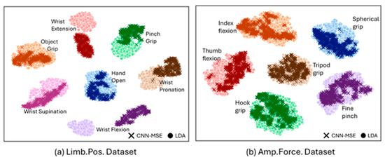 Based on improved recognition accuracy from transforming sEMG features into Fisher’s discriminant subspace, we proposed a novel CNN-LDA framework to approximate Fisher’s representation. We tested two variants of our hybrid CNN-LDA framework, the CNN-CEMSE and CNN-MSE, using eight feature sets, across two public datasets. Our results indicate that both variants effectively lowered the recognition error compared to a naive CNN-CE, with improvement ranges from 7% to 11% based on the Limb.Pos. dataset and 4% to 11% based on the Amp.Force. dataset. Notably, based on the Limb.Pos. dataset, we achieved a state-of-the-art performance with the Ext-23 feature set (Figure 7), recording the lowest error of 22.79% with the CNN-MSE, a 2.06% improvement over the TD-PSR [7]. However, based on the Amp.Force. dataset, the CNN-LDA and Ext-23 feature set combination did not achieve state-of-the-art results, with recognition errors 1% higher than the Ext-23 feature set with the LDA, and 2.4% higher than the LDA with Phinyomark’s and TD8-AR features (Figure 10). Yet, the result of the CNN-LDA with the Ext-23 feature set remains competitive, showing overall improvements over most of the tested pipelines (Figure 10) and a minimal inference time (Table 4).