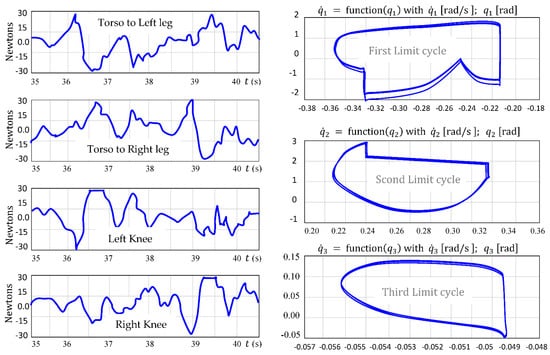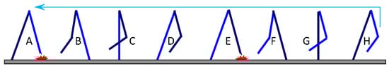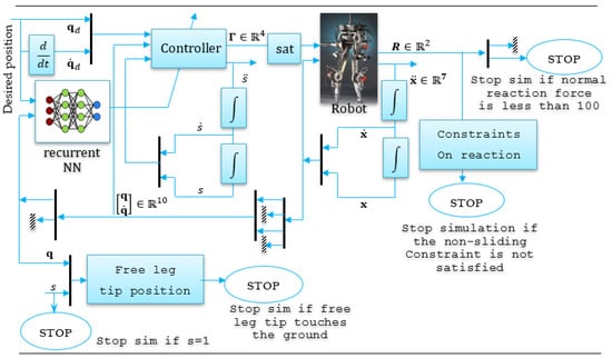 The model comprises seven differential equations, and we have nine unknowns, which are joint acceleration with seven components and the two components of the force of reaction . This system can be completely defined by writing the stress equation with respect to the foot in contact with the ground. The foot in contact must not slip or take off, so its position is constant, and therefore, its speed and acceleration are zero. Thus, we have the position of the foot in support denoted by , and it is as follows: ; ; . We deduce, analogously to the kinematic and dynamic constraints, and , where is a matrix of dimension , and is given as . By combining the equations of the dynamic model and the second equation’s constraint on the acceleration of the foot in support, we obtain a ninth-order system, , with . Thus, acceleration and the reaction force are given by the following [17,18,19,30]: