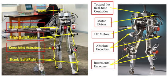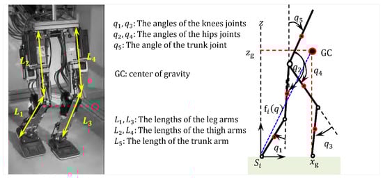 The considered robot is an “underactuated RABBIT” prototype model presented in Figure 3. The biped is composed of five bodies (links), a trunk, and two identical legs. Each leg consists of two bodies articulated at the knee. Knees and hips are pivot joints assumed to be frictionless and without mechanical play. The vector of generalized coordinates , which describes the configuration of the biped, is composed of of the relative-angle motors defining the shape of the robot and , defining the situation of the trunk of the robot with respect to a fixed frame in the vertical plane . is the absolute orientation of the trunk, and and are the coordinates of the center of mass of the biped. The robot’s position is described by its center of gravity, simplifying impact modeling and integrating it into the system’s dynamics. The biped, powered by four motors, has joint torques acting on the knees and hips (see Figure 4 and Figure 5 [25,28,31]).