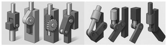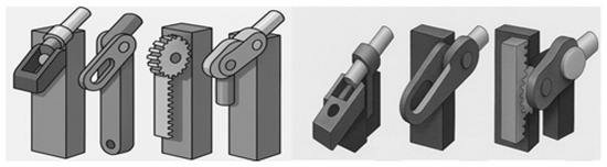 Now, we present the geometric model to express joint variables in terms of Cartesian variables. To simplify calculations, we define the absolute angle on the robot (see Figure 7) and compute them based on Cartesian parameters , , and . A change in variable allows expressing the geometric model in terms of relative variables used for dynamics.