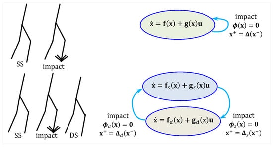 A walking gait consists of alternating single-support, impact, and double-support phases. The system state , comprising configuration and velocity variables, evolves according to a hybrid model , and . Here, is the control input, and , , and are nonlinear continuous functions. The impact set defines the switching surface containing all states that trigger a ground impact. The second expression (as given by Westervelt and Chevallereau) models the instantaneous velocity change at impact (see [28]).
