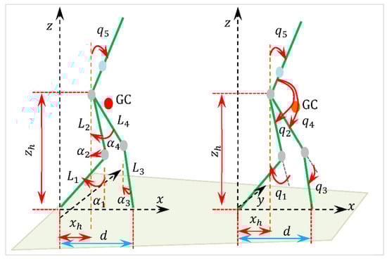 We decompose our calculation on the two legs, and the benchmark with respect to which all calculations are performed is related to the ankle of the rear support leg. The loop closure makes it such that the height of the hip, , is the same for the two legs, and the distance between the legs is constant. This leads to the following constraints: ; ; , where and . In Table 1, we have lengths ; this equality can greatly simplify calculations, but we prefer to keep different lengths to generalize the calculation and leave the choice of adding robustness to others. From the inverse geometric model, we have absolute angles , , , and in the function of step length , the abscissa of the hip , and the height of the hip . We already have the absolute angle , which is also known. We obtain the following relations: , , and , , , and . With angle being known, we have a system of four equations, and four unknowns can be solved easily to give us the expressions of the required positions: