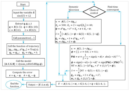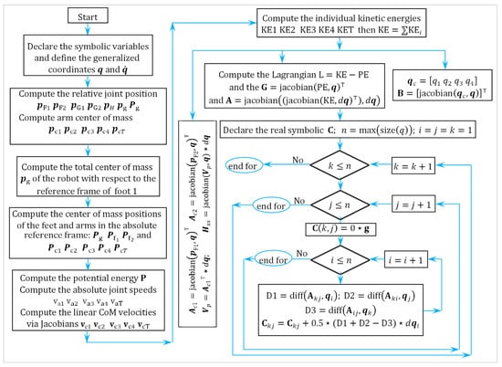 Thus, we have , with and . The matrices of the 7 DOF RABBIT robot model during single support were computed using MATLAB’s (R2023) symbolic toolbox (see Appendix A). Figure 8 clearly shows the detailed modeling flowchart, from defining symbolic variables to deriving the system matrices via the .