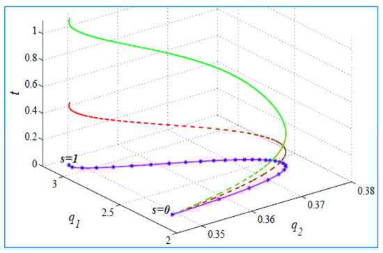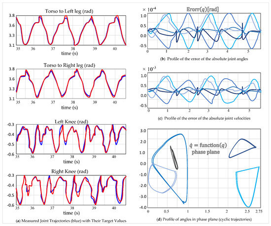 - For the first single support, the two legs change their roles from one step to another , where the matrix is the permutation matrix. The trajectory in polynomial form is , and . The optimal values of , are given in [21]. Figure 9 shows how joint motion differs from the path.