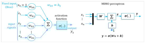 The structure of the multi-input single-layer perceptron vs. MIMO perceptron: the figure explains the neural network architectures used for function approximation in bipedal control systems. The perceptron sums weighted input , applies an activation function , and produces output . The MIMO perceptron uses a weight matrix and bias to produce the output .