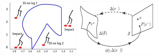 Here, the superscripts (+) and (−) denote post- and pre-impact velocities, respectively, while represents the final configuration of the single-support phase. The contact forces, being theoretically infinite upon impact, yield finite impulsive effort when integrated over the vanishing impact duration. The acceleration of the robot is taken as infinite, and by integrating it, we obtain the velocity variation . As is invertible, the velocity after impact is , so we obtain . When matrix is of full rank, this equation enables us to calculate under the assumption that (), so . Moreover, one can derive an alternative formulation without the use of (see [23,25]). First, we define then,