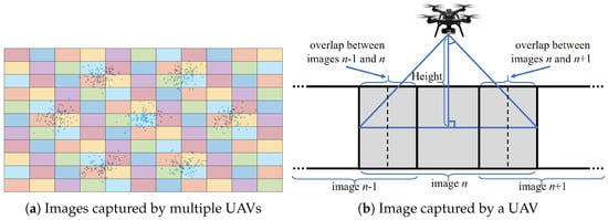 The area covered by UAVs is divided into a grid, as shown in Figure 1a. Each rectangle corresponds to the area that a UAV covers while hovering in the center of the rectangle, as shown in Figure 1b. We call this UAV location the waypoint of the corresponding rectangle. Figure 1b also shows that the adjacent images overlap. The UAV is capturing the nth image in Figure 1b. The images and are to the left and right of the nth image, and this sequence of images can continue depending on the flight path of the UAV. This path is indicated with the dotted lines on images and . The overlap is purposely added to the flight paths due to errors in the location and orientation of the UAVs. Therefore, the images need to be realigned to form the grid in Figure 1a. The problem of aligning images and locating targets in overlapping areas is beyond the scope of this paper. We address this problem in our previous work in [39]. Each UAV is assigned a flight path that corresponds to a subset of waypoints on the grid and the order in which they are visited. UAVs fly through their sequence of waypoints periodically. We refer to a period as a tour. Tours from different UAVs are assumed to be disjoint, which means that each waypoint is assigned to one and only one UAV. The set of observations detected by during a tour is .