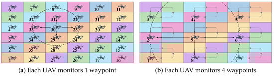 Figure 2 shows an example of the transmission in line 13 of Algorithm 1. In Figure 2a, is self-selected and transmits , , , and to its neighbors: , , , and . These transmissions take place one at a time. Each transmission corresponds to one loop of the for loops in lines 5 to 15 of Algorithm 1. Each neighbor executes Algorithm 2 when it receives its corresponding message . In Figure 2b, each UAV monitors four waypoints. In this case, has self-selected, and its transmission range is larger to reach its neighbors: , , , and .