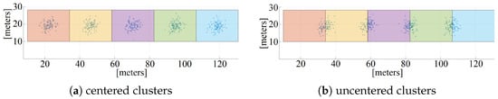 Two different cluster configurations are considered, centered and uncentered. The cluster centroids are in the center of the rectangular areas in the centered configuration (Figure 3a), and they are at the border between adjacent areas in the uncentered configuration (Figure 3b). All clusters have 100 targets and covariance matrix unless otherwise specified.