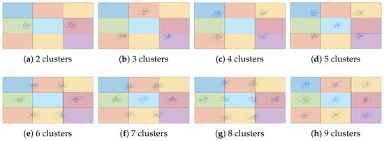 The grid flight formation is shown in Figure 4. It is also assumed that each rectangular area corresponds to a hovering UAV in the center of the rectangle and that only adjacent UAVs are within communication range of each other, including both vertical and horizontal directions. Therefore, each of the UAVs at the corners of the grid has two neighbors; each of the other UAVs at the boundary of the grid has three neighbors, and each of the UAVs in the interior of the grid has four neighbors. There are eight different cluster configurations with an increasing number of clusters, starting with two clusters, as shown in Figure 4a. Figure 4b–h show the cluster configurations with three to nine clusters, respectively. The grids in Figure 4 all have nine UAVs each, which is a grid of . Larger grids are also included in our simulation results, from to . In these cases, rectangular areas decrease in size, and cluster configurations remain the same. For example, Figure 1a shows the grid with seven clusters, which are the same seven clusters shown in the grid in Figure 4f. Increasing the dimensions of the grid implies that the rectangular areas decrease in size to cover the same overall area. This is equivalent to covering the same overall area with a higher number of UAVs hovering at lower altitudes.