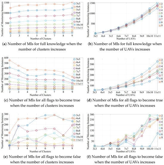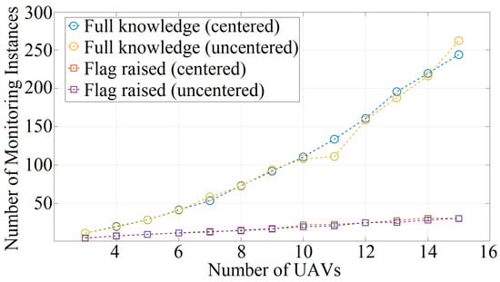 Convergence in [51] requires at least 1000 MIs in a network of 100 temperature sensor nodes of higher connectivity (i.e., lower diameter) than our grid. Convergence in [52] requires 12 MIs in a network of 7 UAVs in linear formation that determine the location of a target UAV detected by all monitoring UAVs under Gaussian noise. In our monitoring algorithm, UAVs require no more than 600 MIs, according to Figure 6c and Figure 7c, and 7 UAVs in linear formation require 16 MIs, according to Figure 5.